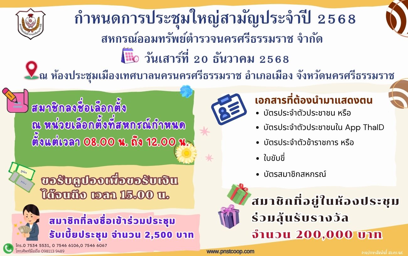 ประกาศสหกรณ์ออมทรัพย์ตำรวจนครศรีธรรมราช จำกัด เรื่อง การเสนอราคาประกันชีวิตกลุ่ม สหกรณ์ฯ มีความประสงค์จะทำประกันชีวิตกลุ่มให้แก่สมาชิกประจำปี 2569 จึงให้บริษัทประกันชีวิต/ประกันวินาศภัยกลุ่ม ยื่นเสนอราคาการทำประกันชีวิตกลุ่ม พร้อมรายละเอียดเงื่อนไขต่าง ๆ ของการทำประกันชีวิตกลุ่ม โดยให้บริษัทที่เสนอราคาแนบเอกสารประกอบการเสนอราคา ได้ตั้งแต่ วันที่ 1-10 ตุลาคม 2568 เวลา 8.30 -16.30 น. เว้นวันหยุดราชการ สอบถามรายละเอียดได้ที่ 0 7534 5531,0 7546 6106,0 7546 6067 ต่อ 14 ฝ่ายงานธุรการ