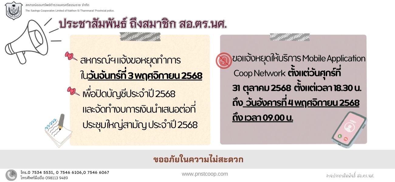 สหกรณ์ออมทรัพย์ตำรวจนครศรีธรรมราช จำกัด แจ้งเกี่ยวกับแอปพลิเคชั่น Coop Network ด้วยสหกรณ์ ต้องจัดทำหนังสือยืนยันยอดหุ้น หนี้ เงินรับฝาก ประจำปี 2568 เพื่อส่งให้สมาชิกตรวจสอบทุกสิ้นปีทางบัญชีของสหกรณ์ จึงขอแจ้งให้ทราบว่าการทำธุรกรรมผ่านแอปพลิเคชั่น Coop Network จะไม่สามารถใช้งานได้ชั่วคราว ในระหว่างวันอาทิตย์ที่ 31 สิงหาคม 2568 เวลา 18.00 น. ถึง วันจันทร์ที่ 1 กันยายน 2568 เวลา 12.00 น.