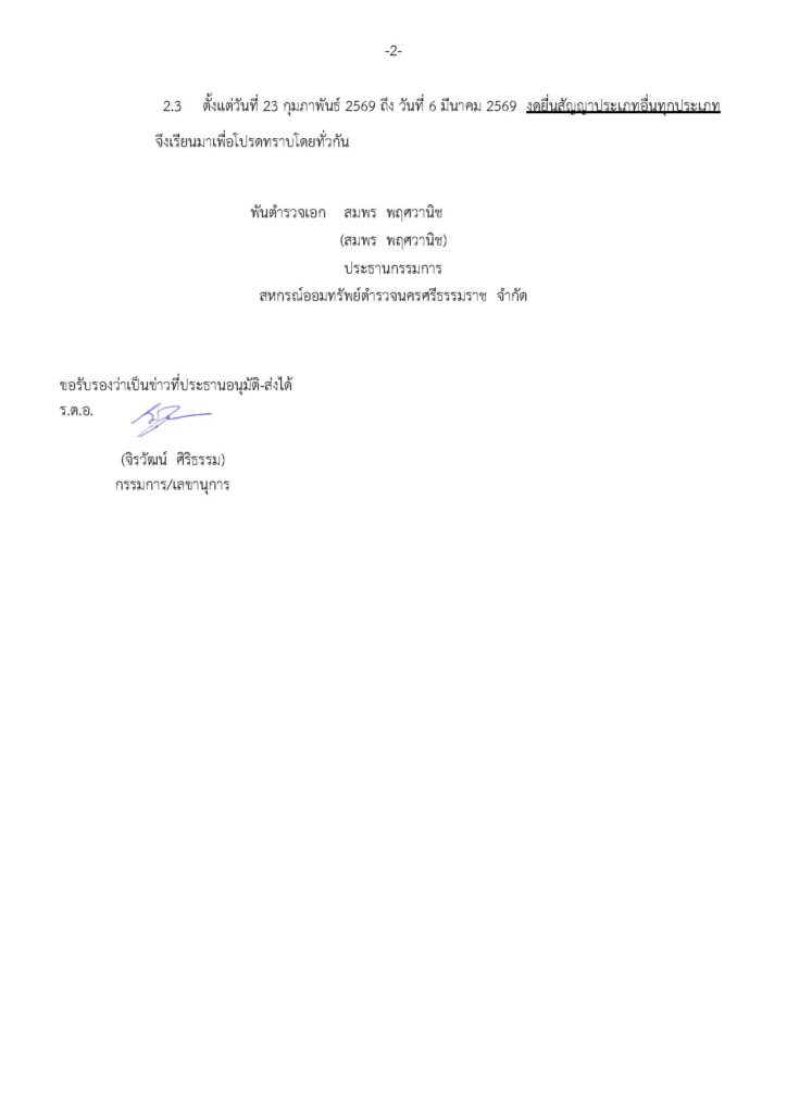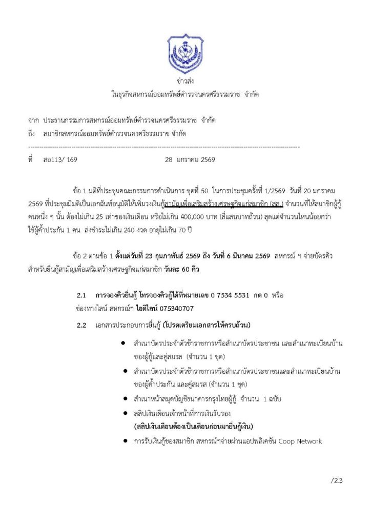 ข่าวส่งในธุรกกิจสหกรณ์ออมทรัพย์ตำรวจนครศรีธรรมราช จำกัด คณะกรรมการดำเนินการชุดที่ 50 ในการประชุมครั้งที่ 1/2569 วันที่ 20 มกราคม 2569 มีมติอนุมัติให้เพิ่มวงเงินกู้สามัญเพื่อเสริมสร้างเศรษฐกิจแก่สมาชิก (สส.) รายละเอียดตามใบข่าวส่งBy Admin_coop / January 29, 2026 ข่าวส่งในธุรกกิจสหกรณ์ออมทรัพย์ตำรวจนครศรีธรรมราช จำกัด คณะกรรมการดำเนินการชุดที่ 50 ในการประชุมครั้งที่ 1/2569 วันที่ 20 มกราคม 2569 มีมติอนุมัติให้เพิ่มวงเงินกู้สามัญเพื่อเสริมสร้างเศรษฐกิจแก่สมาชิก (สส.) รายละเอียดตามใบข่าวส่ง Views: 9