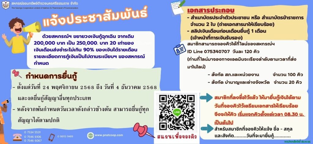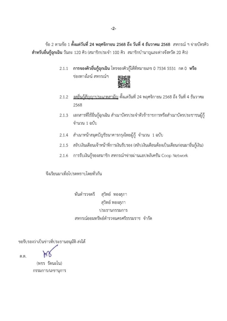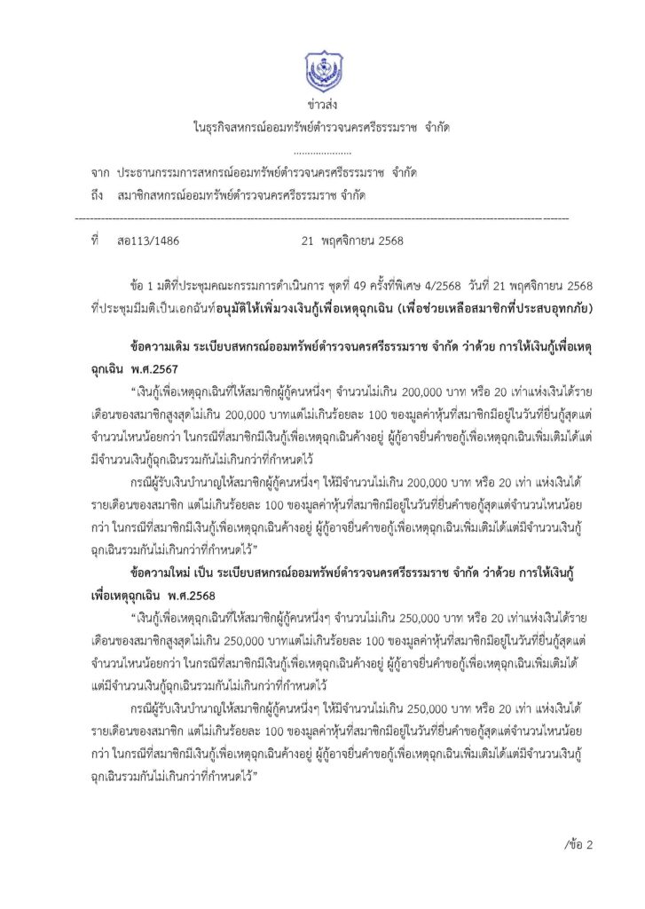 ข่าวส่ง มติที่ประชุมคณะกรรมการดำเนิน ชุดที่ 49 ครั้ง4/2568 วันที่ 21 พฤศจิกายน 2568 ที่ประชุมมีมติเป็นเอกฉันท์อนุมัติให้เพิ่มวงเงินกู้ฉุกเฉิน (ฉ1) (เพื่อช่วยเหลือสมาชิกที่ประสบอุทกภัย) รายละเอียดตามเอกสารที่แนบ