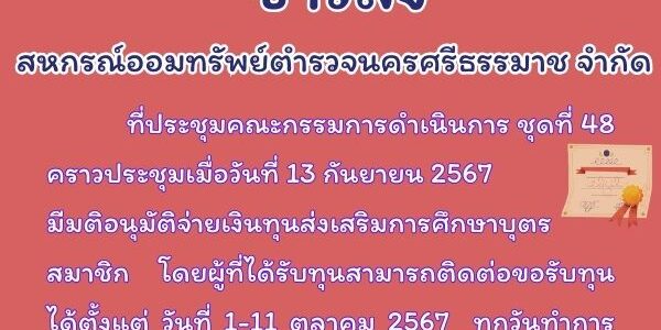 ข่าวส่ง ในธุรกิจสหกรณ์ออมทรัพย์ตำรวจนครศรีธรรมราช จำกัด แจ้งรายชื่อบุตรสมาชิกที่ได้รับทุนส่งเสริมการศึกษาสมาชิก ประจำปี 2567 รายละเอียดแนบพร้อมนี้ กำหนดรับเงินตั้งแต่วันที่ 1-11 ตุลาคม 2567 ในวันทำการของสหกรณ์ ตั้งแต่เวลา 08.30 น. – 14.00 น. เว้นวันหยุดราชการ