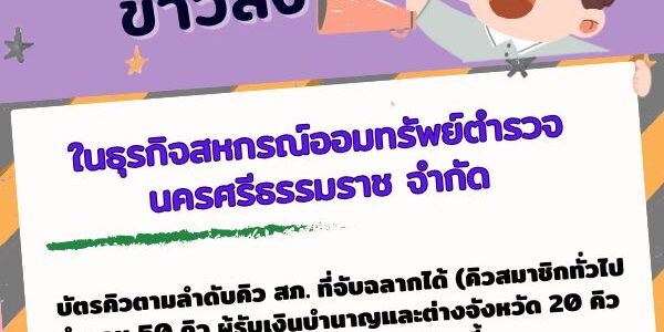 ข่าวส่ง ในธุรกิจสหกรณ์ออมทรัพย์ตำรวจนครศรีธรรมราช จำกัด เงินกู้สามัญเสริมสร้างเศรษฐกิจแก่สมาชิก (สส.) จำนวนสูงสุดไม่เกินคนล 150,000 บาท (หนึ่งแสนบาทถ้วน) อัตราดอกเบี้ยร้อยละ 5.70 บาทต่อปี ส่งชำระคืนสหกรณ์ฯ ไม่เกิน 180งวดเดือน ใช้คนค้ำประกัน 1 คน ค้ำประกันได้ไม่เกิน 2 สัญญา นัน คิวกู้แนบมาพร้อมนี้