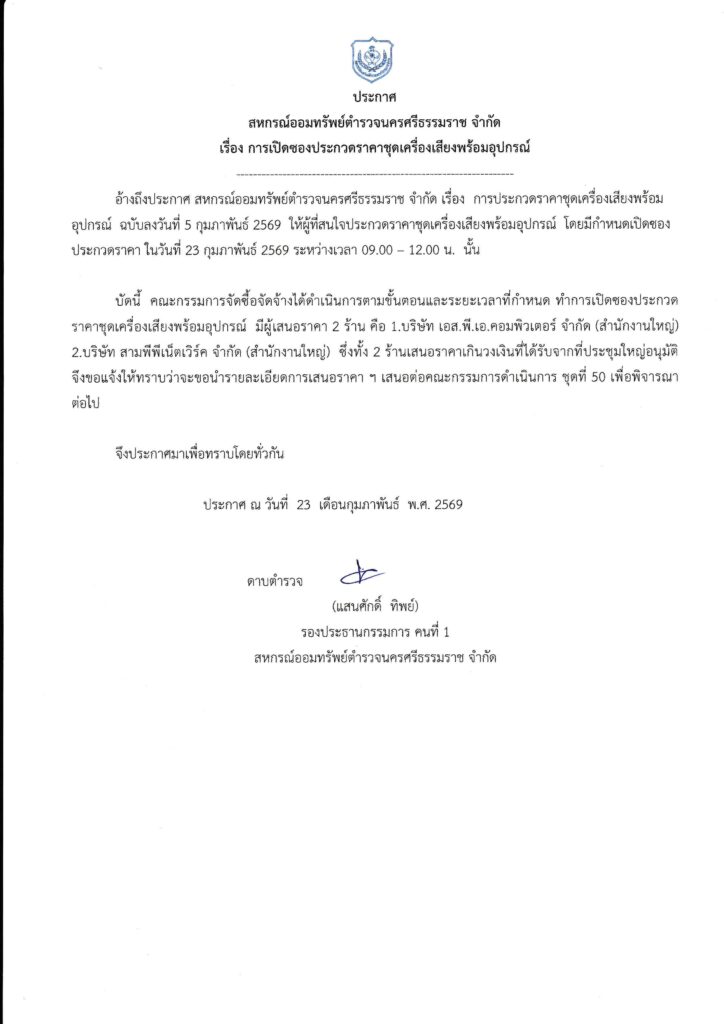 ประกาศ สหกรณ์ออมทรัพย์ตำรวจนครศรีธรรมราช จำกัด เรื่อง การเปิดซองประกวดราคาชุดเครื่องเสียงพร้อมอุปกรณ์By Admin_coop / February 23, 2026 Views: 1