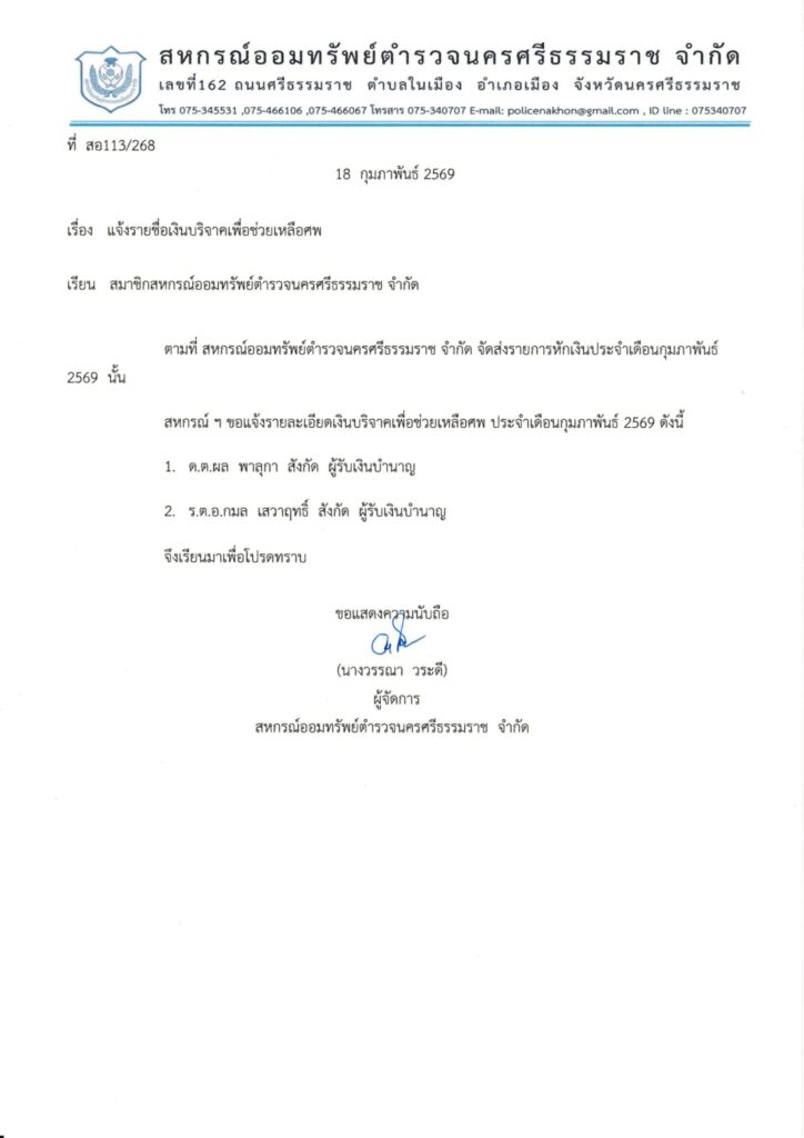 แจ้งรายชื่อเงินบริจาคเพื่อช่วยเหลือศพประจำเดือนกุมภาพันธ์ 2569By Admin_coop / February 20, 2026 Views: 1