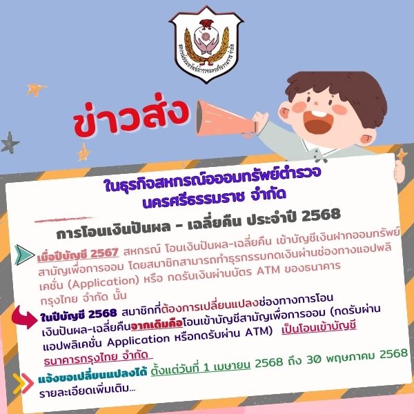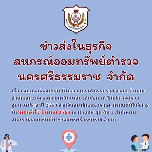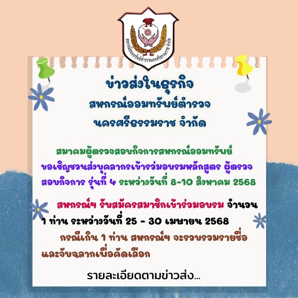 ข่าวส่งในธุรกิจสหกรณ์ออมทรัพย์ตำรวจนครศรีธรรมราช จำกัด สหกรณ์รับสมัครตัวแทนสมาชิกฯ เข้าร่วมโครงการจัดทำแผนกลยุทธ์ กำหนดจัดทำในวันที่ 21-22 มิถุนายน 2568 รายละเอียดตามข่าวส่งที่แนบมาพร้อมนี