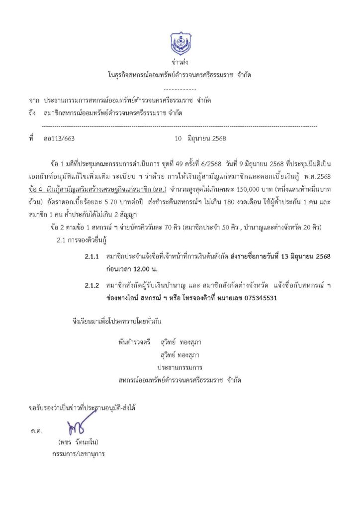 ข่าวส่ง มติที่ประชุมคณะกรรมการดำเนิน ชุดที่ 49 ครั้ง4/2568 วันที่ 21 พฤศจิกายน 2568 ที่ประชุมมีมติเป็นเอกฉันท์อนุมัติให้เพิ่มวงเงินกู้ฉุกเฉิน (ฉ1) (เพื่อช่วยเหลือสมาชิกที่ประสบอุทกภัย) รายละเอียดตามเอกสารที่แนบ